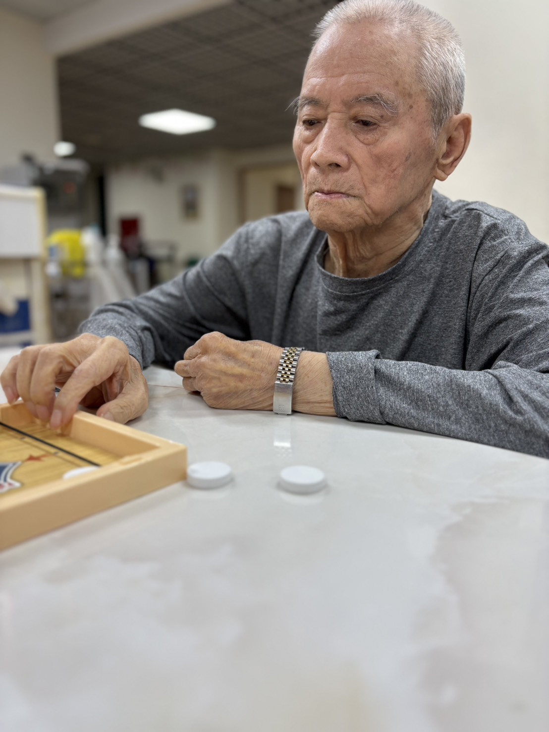 今天安排了長輩進行彈彈棋對戰,小小的桌面遊戲,卻讓現場充滿笑聲與專注。