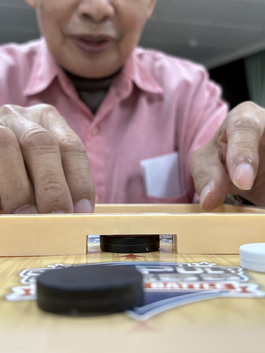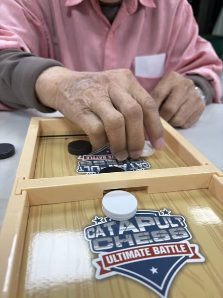今天安排了長輩進行彈彈棋對戰,小小的桌面遊戲,卻讓現場充滿笑聲與專注。