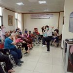 一早工作人員就忙著場佈、協助住民下樓,隨著音樂響起,大家面對大門口跟著老師一起伸展、擺動、笑聲不斷